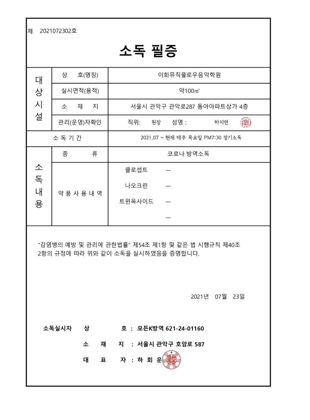 저희 원은 병원 전문 소독 방역 업체로 부터 인체에 무해한 성분으로